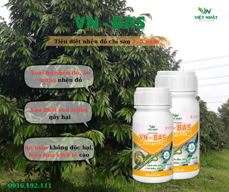 Sử dụng chế phẩm sinh học VN – BAS cũng là cách trị nhện đỏ hại sầu riêng được sử dụng phổ biến. Không chỉ giúp loại bỏ nhện đỏ hiệu quả mà còn đảm bảo được an toàn tuyệt đối cho sức khỏe con người và môi trường. Bên cạnh đó, bà con cũng nên bón phân để bổ sung vi lượng phục hồi cho cây, từ đó tăng cường dinh dưỡng.