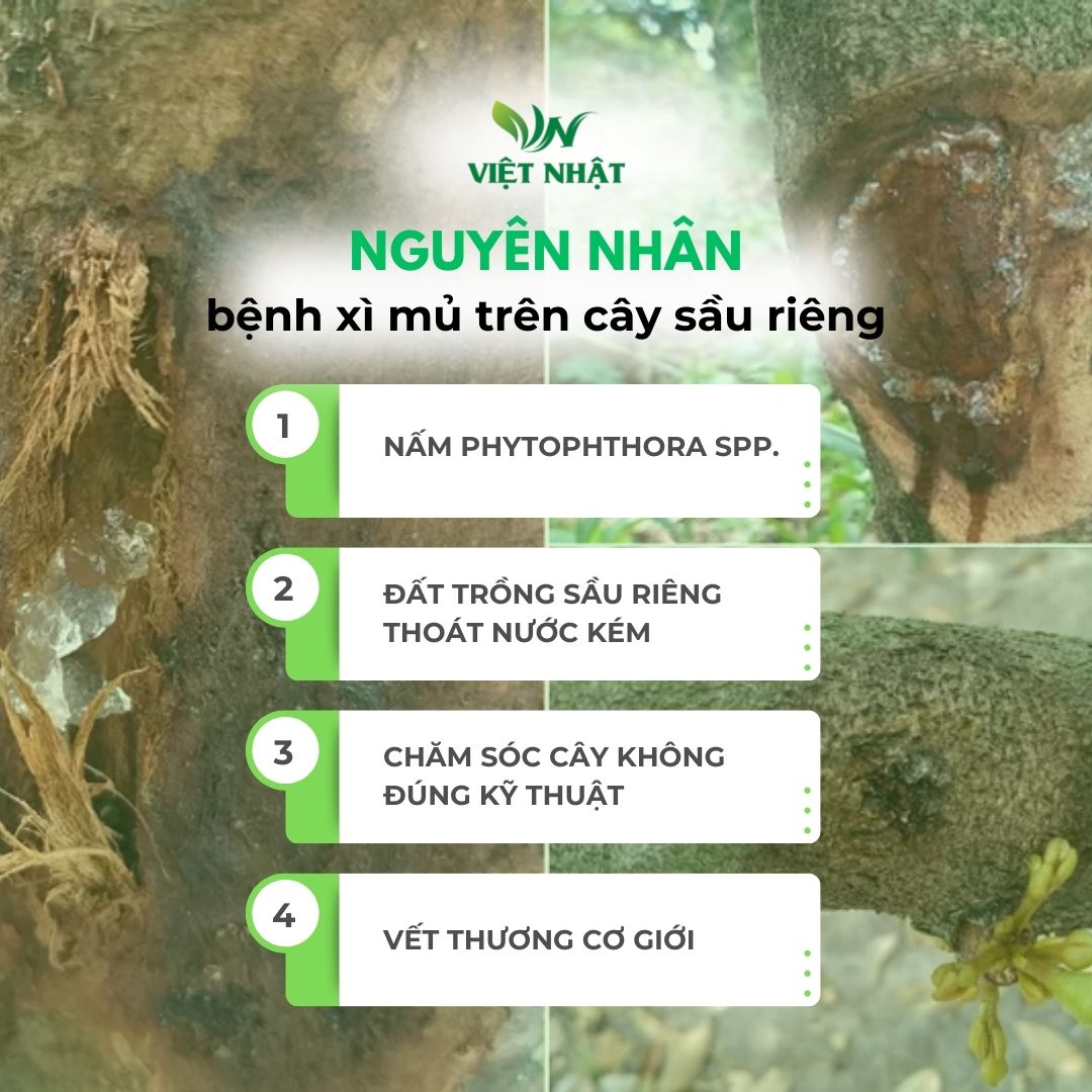 Bệnh xì mủ (Phytophthora spp.) là một trong những căn bệnh khiến sầu riêng không năng suất vậy nguyên nhân từ đâu và cách khắc phục như thế nào? Hãy cùng Việt Nhật tìm hiểu nha!